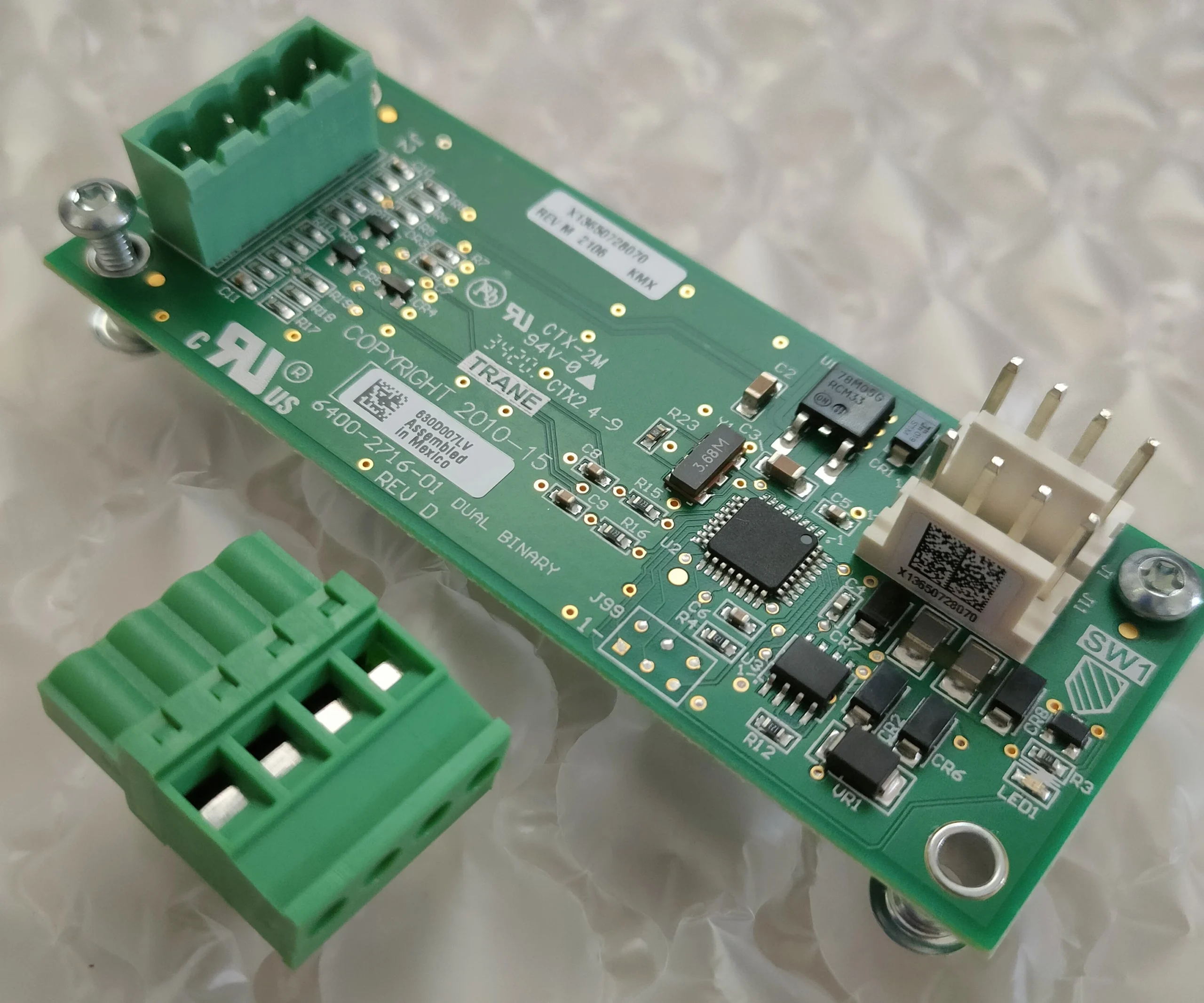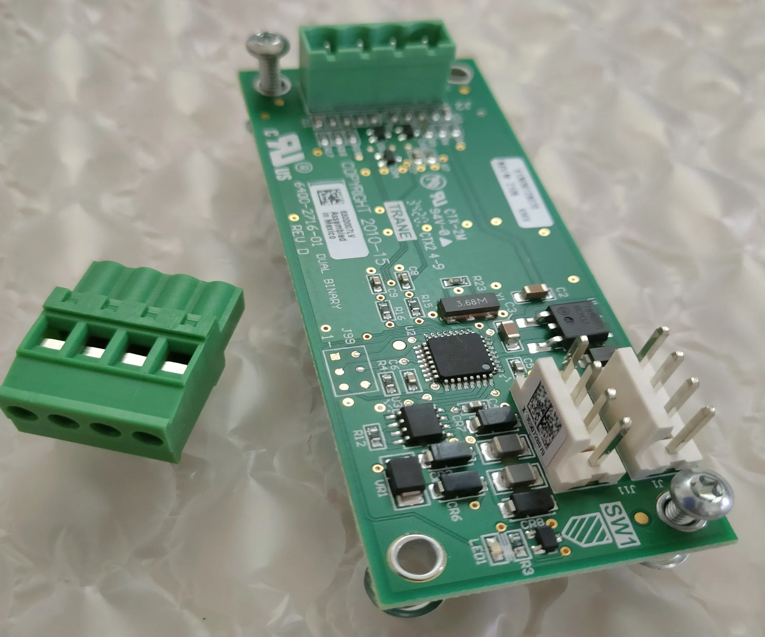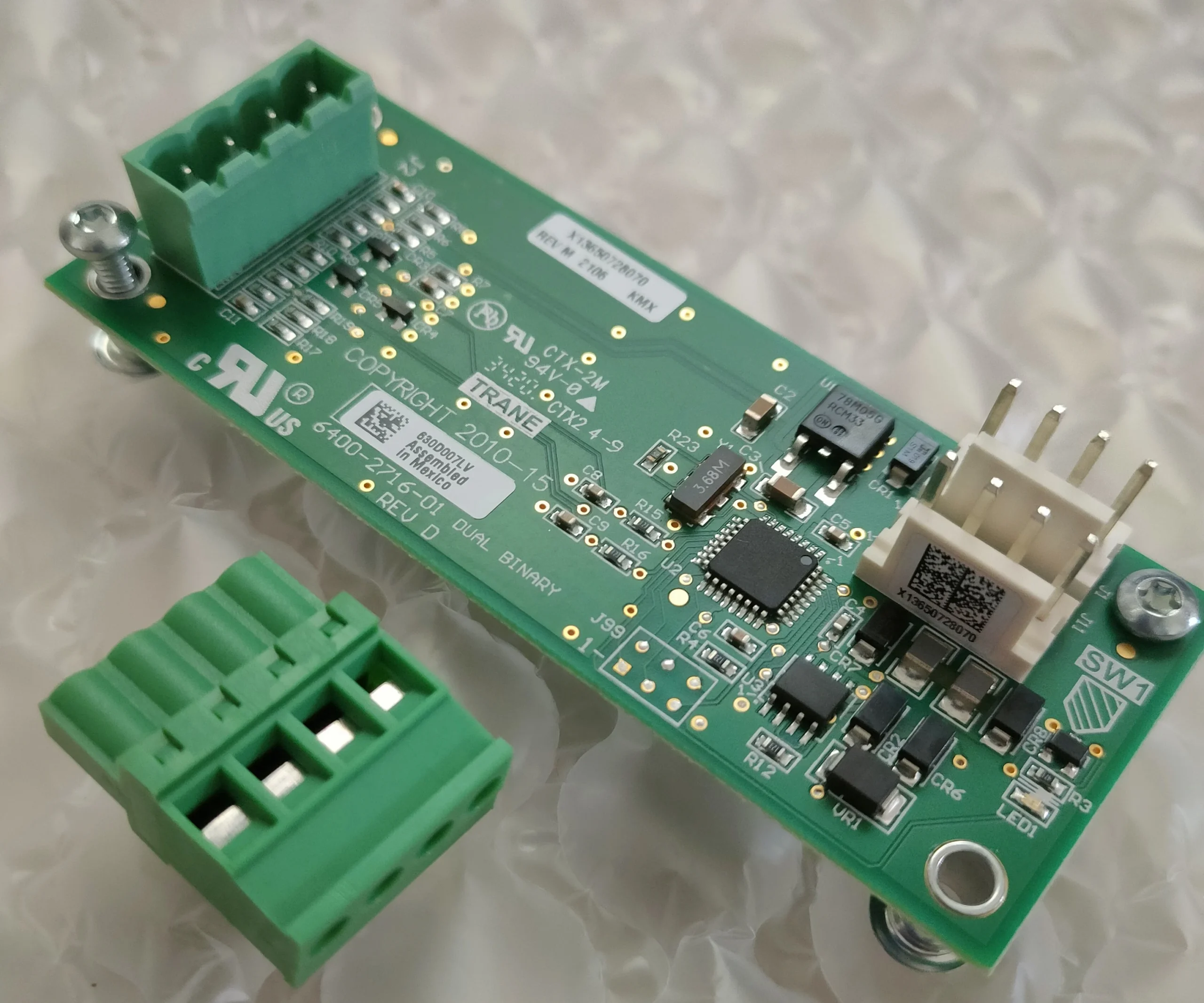 The Trane BRD04873 Dual Binary Input Module is an OEM-grade sensor board designed to accept two binary (on/off) signals from external devices such as compressors, pumps, or limit switches. It serves as an essential component in Trane’s commercial HVAC and refrigeration systems, converting external binary inputs into readable signals for the system controller.