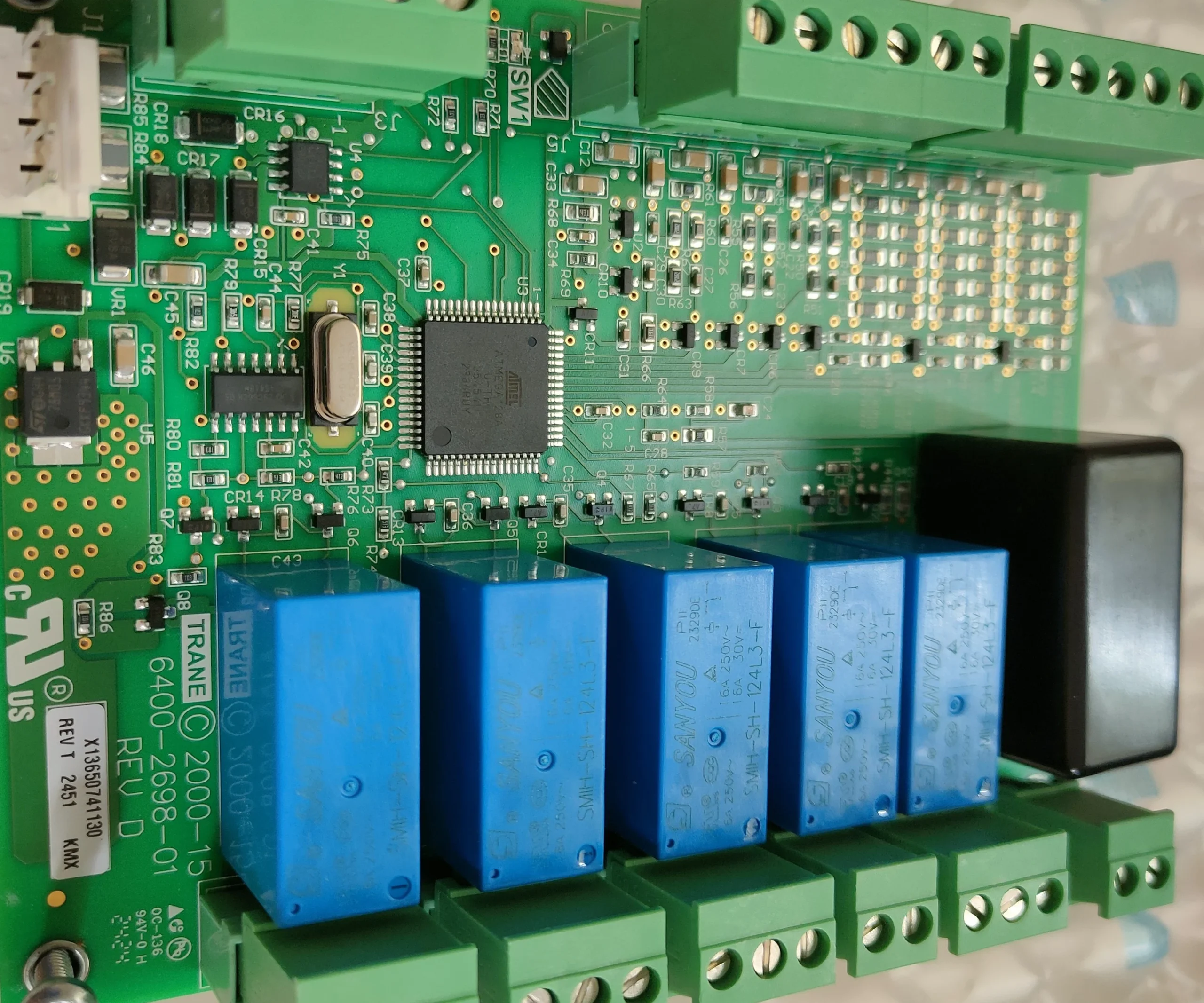 Equipped with pluggable terminal blocks and built on a robust green PCB with stainless-steel connectors, it ensures durability in harsh industrial environments. Ideal for use with Trane and American Standard chillers (RTAC, RTWD series), the board is programmable or “bound” to the unit’s controller (e.g., Tracer CH530 via TechView) before operation.